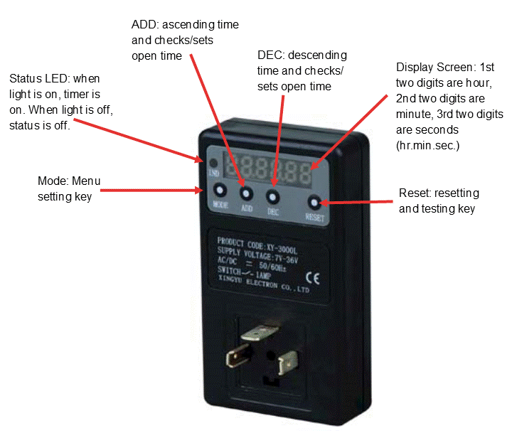 • Press MODE key again and screen will say “000000” and you may begin to set close time by pressing the ADD key and DEC key to set hour, minute and second.