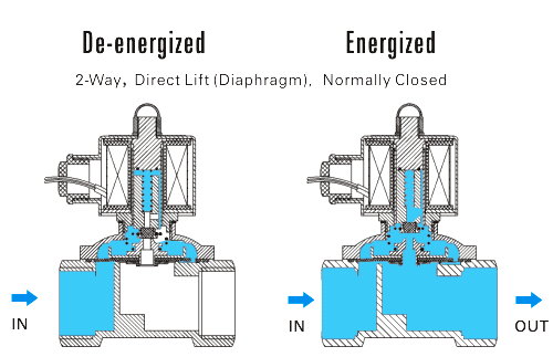 To Open: When the valve is de-energized, the coil releases the plunger. The